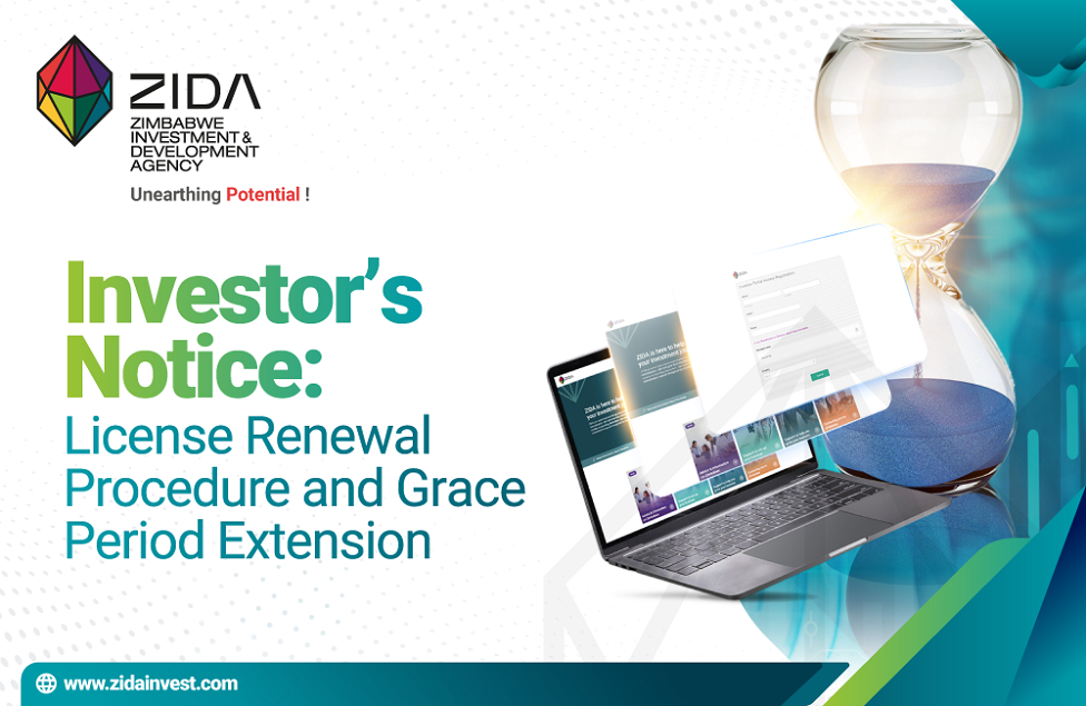 The Zimbabwe Investment and Development Agency wishes to advise its valued investors, that according to our regulations, all renewal applications are supposed to be submitted at least 3 months before the expiry date of such licence according to section 10 (1) of the General Investments Regulations, of SI 227 0f 2023.